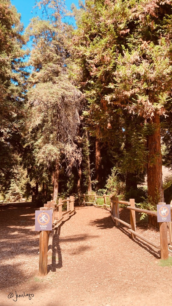 It was a pretty short walk to get to them from the parking lot. It is about 1-mile to the grove. All flat. Very easy. When you get to the Redwood Grove, it is peaceful & quiet. There is a trail through them with benches, so you will likely find one that is free and away from others. I did go on a weekday and therefore cannot vouch for its solitude on weekends. The trail within the redwoods is not very long, so be sure to take your time & take it all in.
