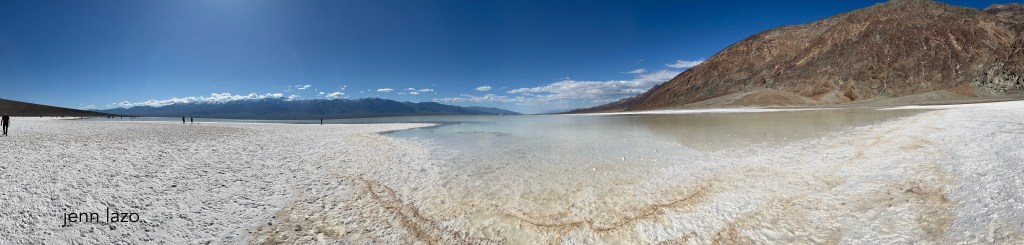 Onwards to Badwater Basin. I had wanted to see it for so long and it was as amazing as I had hoped! It was very crowded, but we found parking off the road nearby. Most of the people went straight ahead from the boardwalk into the water, but we went to the right and it was mostly empty. I cannot recommend this stop enough. Boy was that neat. I walked into the water as far as I could. I didn’t have another pair of pants so was leary of getting salt all over them. My Tevas still have some salt on them. Badwater is the lowest point in North America! It was so clear and stunning. I mean, you see the pictures in magazines and online, but they still don’t prepare you for how freaking cool it is.