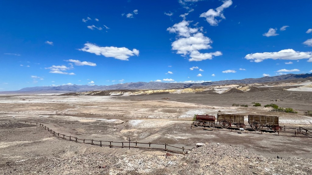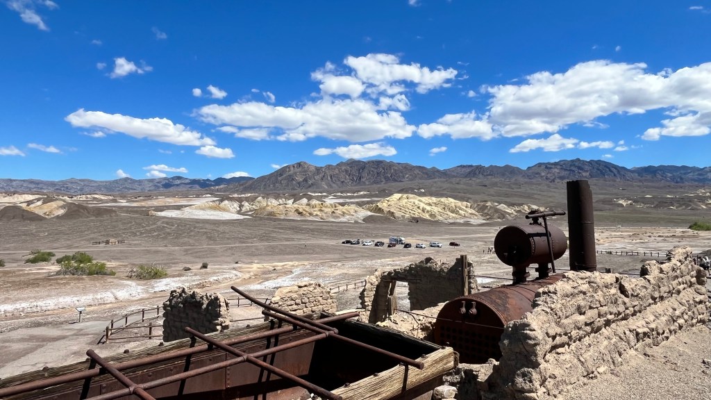 We had some hikes in mind, but ended up seeing a bunch of main attraction/easy access tourist sites that are all near each other instead. Well worth it because everything is stunning. Also, the temperature was way hotter than my phone app claimed it would be, so it was what it was. We started at Harmony Borax Works. I don’t use borax for laundry but kind of want to get some because it’s so old timey. Anyway, there is a parking lot and then a paved path to the attractions. The path is a very easy and short walk, and has some equipment that was used with explanatory signs about it and about the Pacific Coast Borax Company 20 mules mining days.