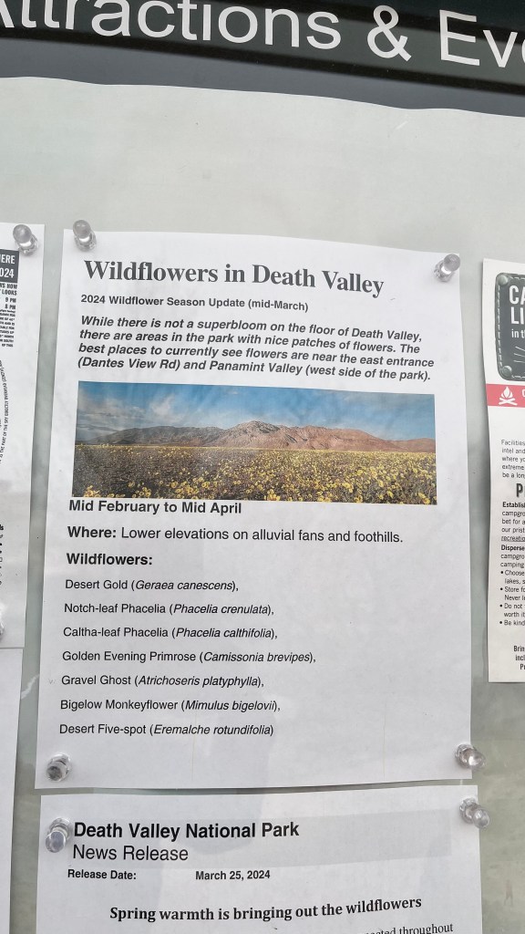 Made a quick stop at the Visitor Center in Furnace Creek to buy our yearly Parks Pass. They have bathrooms there and food nearby. It was very crowded. I suppose everyone wanted to get that last trip in before DV goes into the 100+ degree summer.